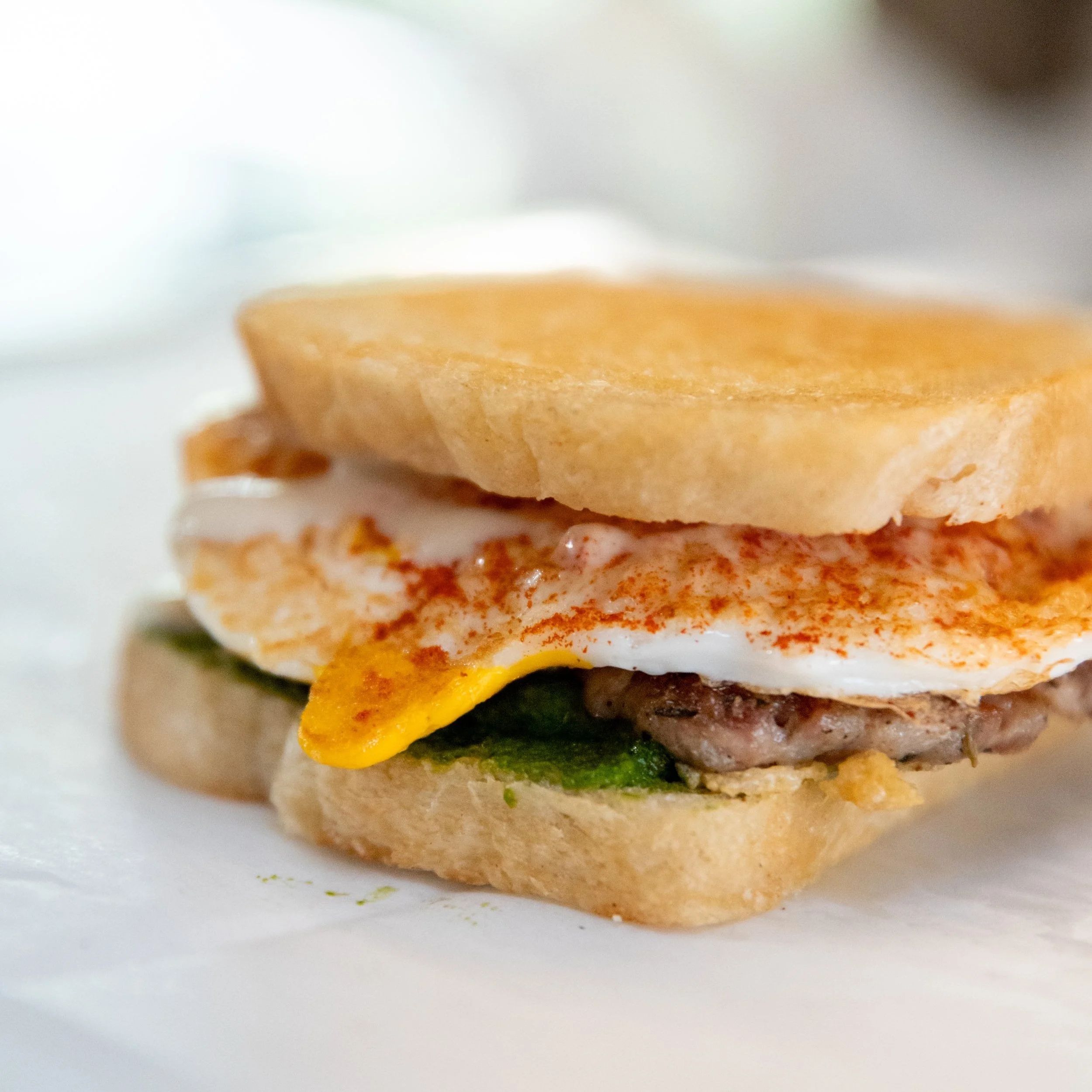 Garlic-Brushed ITALIAN BREAD, Sausage, Fried Egg, Bus Pesto, Parmesan, Herbed Aioli
